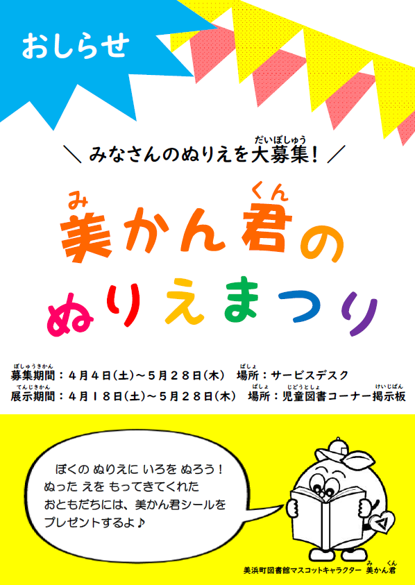「美浜町図書館マスコットキャラクター美かん君」のぬりえに、色をぬって図書館にかざろう!